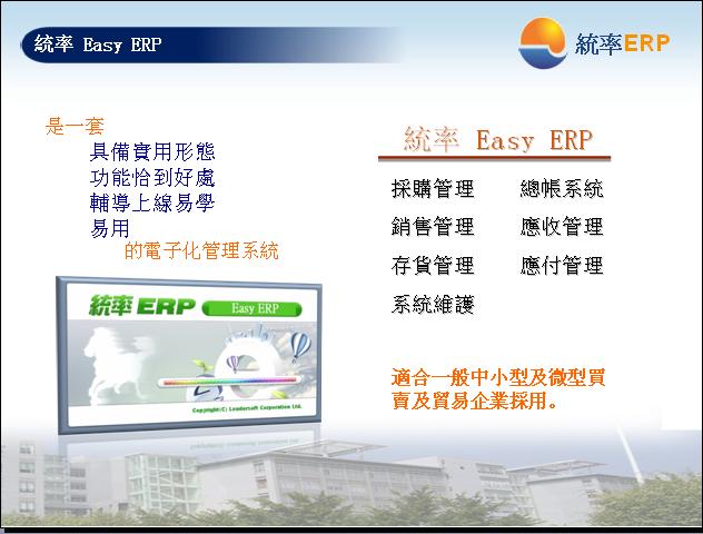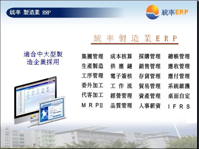 統率資訊依據對ERP 系統開發及客戶服務所累積的優勢,以及配合現在環境企業的需求,特別規劃出三個市場層次:中大型製造業ERP(型號:統率 製造業ERP)、中小型製造業ERP(型號:統率 Super ERP)、以及買賣及貿易業ERP(型號:統率 Easy ERP),主要針對中大型企業、中小型企業、及小型與微型企業適合使用ERP系統的產品。